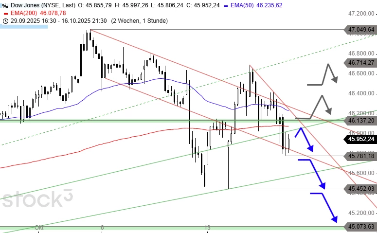 Um die Kaufwelle seit 45.452 Punkten fortzusetzen, müsste man jetzt komplett neues Momentum aufbauen und zunächst die Aufwärtstrendlinie bei 46.050 sowie den Widerstand bei 46.137 Punkten durchbrechen. Gelingt dies, kann eine Erholung bis 46.400 führen. Doch erst oberhalb von 46.550 Punkten wäre ein Angriff auf 46.714 Punkte möglich. Abgaben unter 45.900 Punkte würden dagegen die Bären auf den Plan rufen und unterhalb von 45.750 den nächsten Abverkauf in Richtung 45.452 Punkte einleiten. Darunter droht ein Einbruch bis 45.073 Punkte.