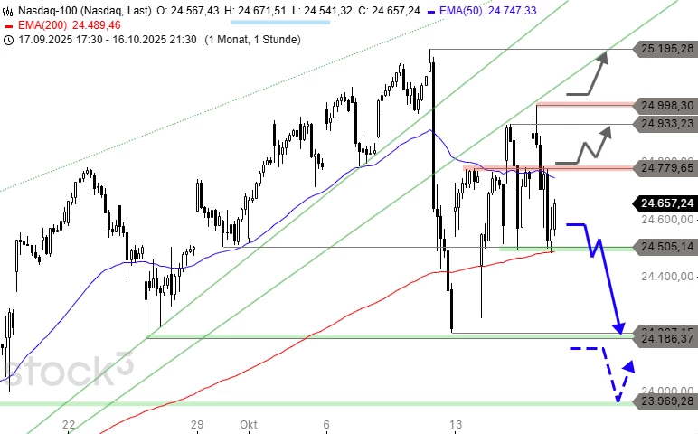 Erst oberhalb von 24.779 Punkten wäre den Bullen ein Befreiungsschlag gelungen und eine Erholung bis 24.880 und 24.933 Punkte möglich. Die 25.050-Punkte-Marke bleibt weiterhin die zentrale Barriere auf dem Weg zum Allzeithoch. Davon ist der Wert jedoch weit entfernt und könnte schon unterhalb von 24.600 Punkten das gestrige Tief bei 24.481 Punkten unterschreiten und in einer weiteren massiven Verkaufswelle auf 24.300 und 24.186 Punkten krachen. Darunter stünde eine Ausweitung des Verkaufsimpulses bis 23.969 Punkten an.