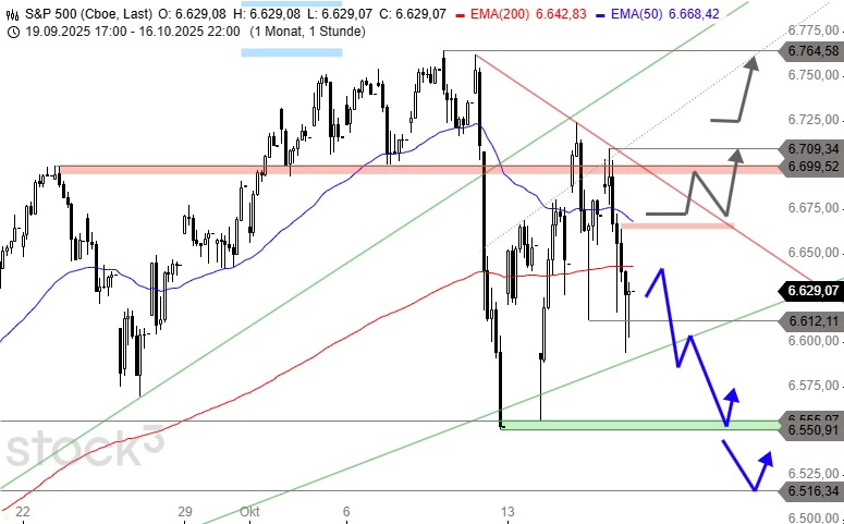 Der S&P 500 bleibt weiter angeschlagen und bräuchte jetzt den schnellen Ausbruch über 6.666 Punkte. Solange dies nicht gelingt und mindestens eine Erholung bis 6.699 und 6.709 Punkte erfolgt ist, sind die Verkäufer weiter im Vorteil und dürften den Wert demnächst in Richtung 6.580 und 6.550 Punkte einbrechen lassen. Auf diesem Niveau hätten die Bullen noch die Chance, ein Verkaufssignal zu verhindern. Darunter dürfte bereits ein Tief von Anfang September im Bereich von 6.516 Punkten angesteuert werden.
