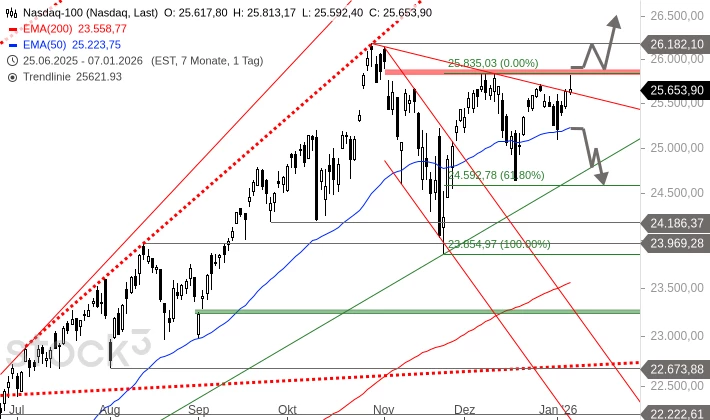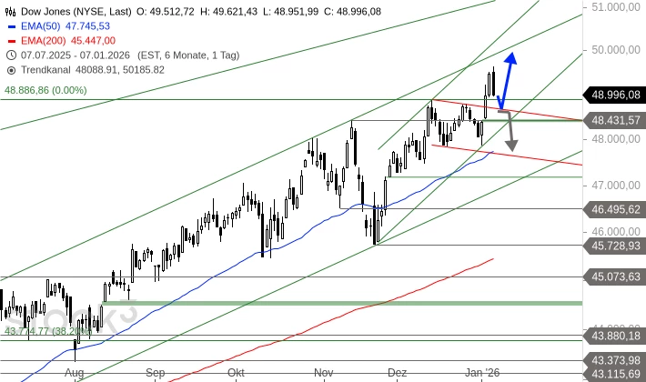 Der Dow Jones ist damit ebenfalls in einer bedeutsamen Phase. Kurzfristig befinden sich wichtige Unterstützungen beim alten Allzeithoch bei 48.886 Punkten sowie am gebrochenen Abwärtstrend ab 12. Dezember, aktuell bei 48.688 Punkten. Solange diese Marken Bestand haben, bleibt das kurzfristige Chartbild bullisch. Ein Rückfall unter diese Marken könnte jedoch eine ausgeprägte Konsolidierungsbewegung in Gang setzen. Erste Anlaufpunkte wären der EMA50 auf Tagesbasis bei 47.745 Punkten und das Gap vom 26. November zwischen 47.196 und 47.182 Punkten.