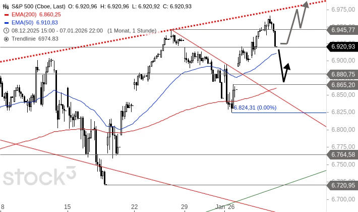 Der S&P 500 erreichte gestern ein neues Allzeithoch bei 6.965 Punkten. Danach geriet der Index allerdings unter Druck und fiel unter das letzte Rekordhoch vom 26. Dezember bei 6.945 Punkten zurück. Erst am vorherigen Hoch aus dem Oktober 2025 bei 6.920 Punkten stoppte der Abverkauf. Um 14:11 Uhr wird der Index zu 6.908 Punkten gehandelt und notiert damit auch unter diesem Hoch.
