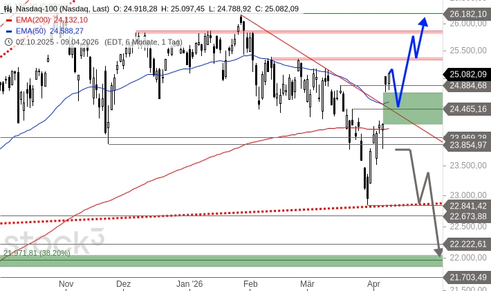 Der Nasdaq 100 bildete gestern ein großes Aufwärtsgap zwischen 24.209 und 24.756 Punkten. In der Spitze notierte der Index bei 25.043 Punkten, zugleich der Eröffnungskurs. Der Schlusskurs lag knapp über dem Widerstandsbereich um 24.841 bis 24.884 Punkte. Mit dem gestrigen Anstieg hat sich das Doppeltop, das nach dem Allzeithoch bei 26.182 Punkten entstanden war, endgültig aufgelöst.