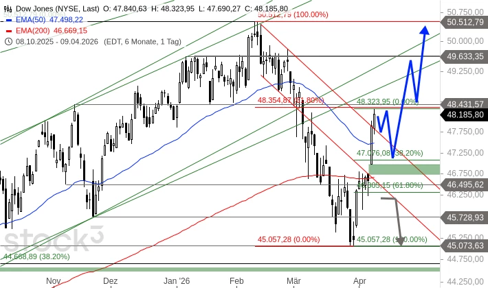 Kurzfristig besteht ein erhöhtes Risiko, dass der Dow Jones in Richtung EMA50 (Tagesbasis) bei 47.470 Punkten oder in das Gap der gestrigen Bewegung zurücksetzt. Mittelfristig existieren weiter Chancen auf eine Rally, zumal noch ein mittel- bis langfristiges Ziel bei ca. 55.500 Punkten offen ist.