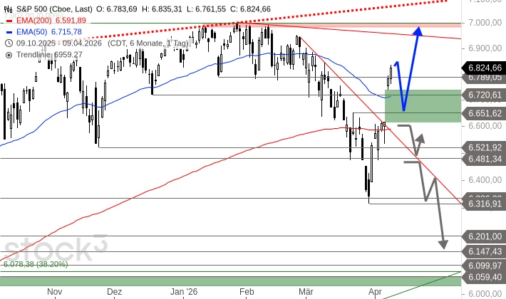 Der S&P 500 bildete gestern ein deutliches Aufwärtsgap zwischen 6.618 und 6.740 Punkten. Er stieg an den Widerstandsbereich um 6.789 Punkte, ohne einen Ausbruch zu schaffen. Mit dem gestrigen Kurssprung wurde die Top-Formation in Form eines Rounding Top, das sich rund um das Allzeithoch bei 7.002 Punkten gebildet hatte, aufgelöst.