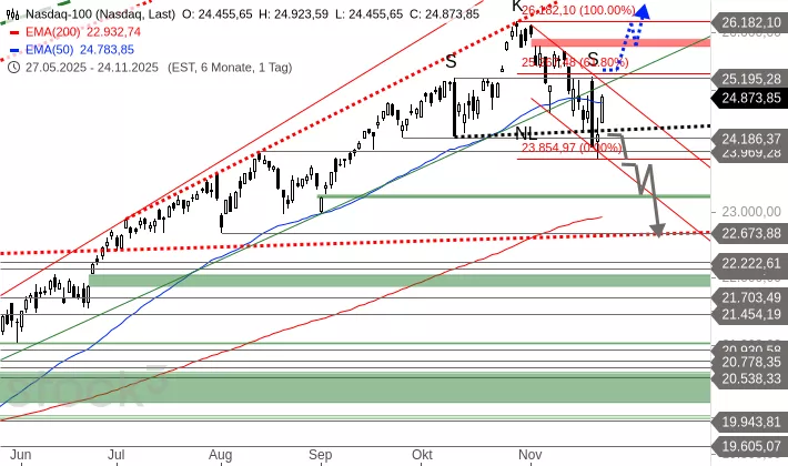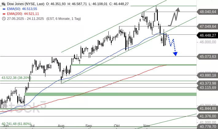 Der Dow Jones befindet sich seit dem Allzeithoch bei 48.431 Punkten vom 12. November in einer Abwärtsbewegung. Am 18. November fiel er unter den Unterstützungsbereich um 46.495 Punkte und durchbrach dabei auch den Aufwärtstrend seit dem 1. August. Am Donnerstag markierte der Index ein Tief bei 45.728 Punkten, woraufhin eine Erholung an den ehemaligen Unterstützungsbereich einsetzte. Dieser konnte jedoch weder am Freitag noch am Montag zurückerobert werden, was die Schwäche unterstreicht.