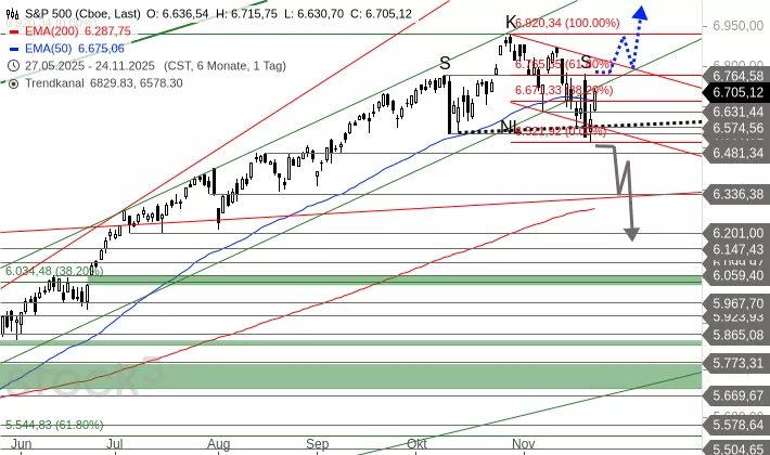 Im S&P 500 sind zwei gegensätzliche Interpretationen der Chartstruktur möglich. Einerseits lässt sich die Entwicklung seit dem Allzeithoch als bullische Flagge deuten, wobei es am Donnerstag zu einer bärischen Übertreibung kam. Andererseits besteht die Möglichkeit einer SKS-Topformation, verbunden mit einem Pullback an den gebrochenen Aufwärtstrend seit Mai 2025. Beide Szenarien sind derzeit valide und stützen sich auf nachvollziehbare Kursverläufe im jüngsten Handelsgeschehen.
