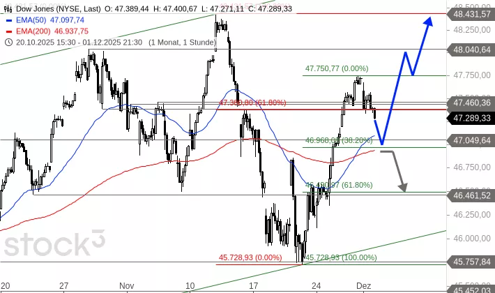 Der Dow Jones zeigte sich im gestrigen Handel schwächer als der Nasdaq 100. Zwar kam es im Tagesverlauf zu einer leichten Erholung, doch diese reichte nicht an das Freitagsniveau heran. Im späten Handel fiel der Index auf ein neues Tagestief, blieb dabei aber oberhalb der offenen Unterstützung bei 47.049 Punkten. Das Gap vom 26. November ist ebenfalls noch offen. Die technische Lage ist kurzfristig angeschlagen, aber bislang wurde kein kritischer Unterstützungsbereich durchbrochen.