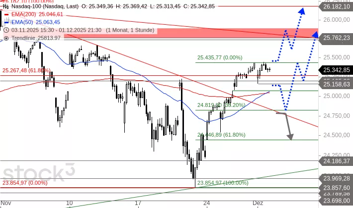 Der Nasdaq 100 bildete nach dem Allzeithoch bei 26.182 Punkten vom 29. Oktober eine bullische Flagge aus und fiel auf ein Tief bei 23.854 Punkten zurück. Seit dem 21. November zieht der Index wieder an. Am 26. November erfolgte der Ausbruch aus der Flagge, einen Tag später auch über den Widerstandsbereich bei 25.195 bis 25.267 Punkten. Nach einem Hoch bei 25.435 Punkten kam es zu einem Rücksetzer auf 24.158 Punkte, bevor sich der Index erneut erholte. Der Bereich um 25.435 Punkte wurde aber erneut nicht überwunden.