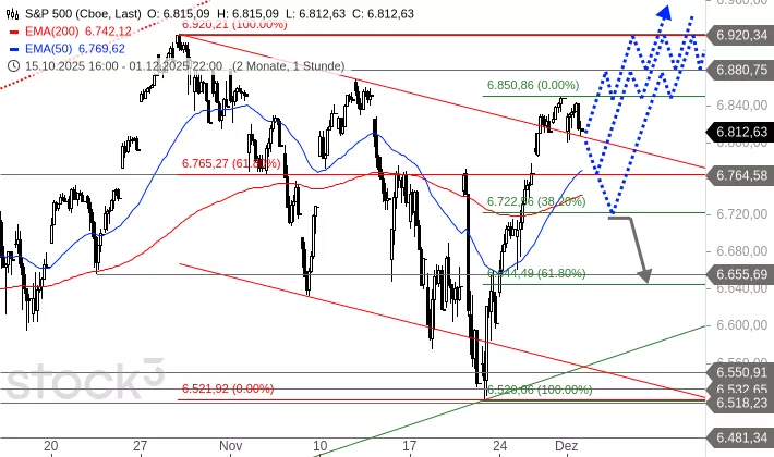 Die Struktur bleibt intakt und das technische Bild bullisch. Kursziele liegen bei 6.920 und im weiteren Verlauf bei über 7.000 Punkten. Rücksetzer bis 6.765 oder 6.723 Punkte wären im kurzfristigen Rahmen möglich, müssen aber nicht zwingend eintreten. Kritisch würde es erst bei einem Rückfall unter 6.723 Punkte. In dem Fall wäre das Ausbruchsszenario gefährdet und weitere Abgaben in Richtung 6.645 bis 6.631 Punkte möglich.