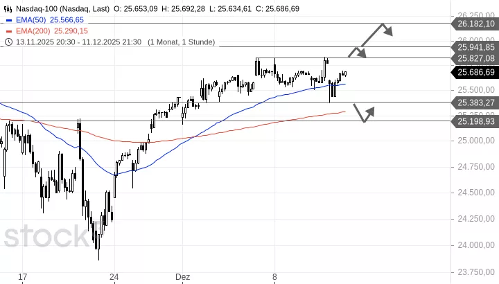 Der Nasdaq 100 hatte am Donnerstag arge Probleme. Der Index bestätigte aber nach einem Abpraller am Widerstand bei 25.827 Punkten tags zuvor zumindest die Unterstützung bei 25.383 Punkten und erholte sich wieder.