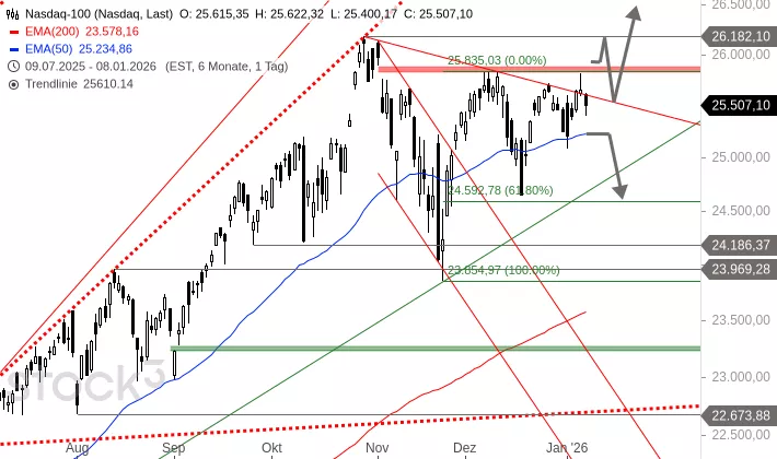 Ein Ausbruch über die Marke von 25.835 Punkten würde die Möglichkeit einer potenziellen Rally in Richtung 26.182 Punkte eröffnen. Kommt es zu einem Rückfall unter den EMA50, könnte der Index bis 24.592 Punkte nachgeben. Ob die Bullen tatsächlich Schwung aufnehmen oder ein Abpraller erfolgt, bleibt kurzfristig weiter offen.