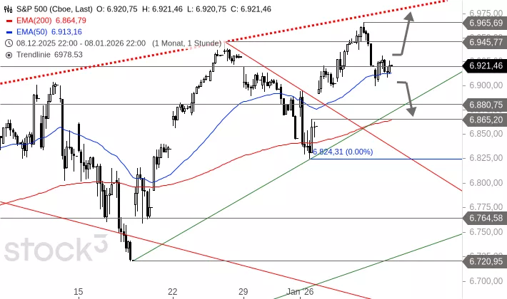 Der S&P 500 eröffnete gestern etwas schwächer und fiel zunächst auf 6.899 Punkte zurück. Nach dieser Bewegung erholte sich der Index und pendelte um das alte Rekordhoch aus dem Oktober 2025 bei 6.920 Punkten. Die kurzfristige Richtungsentscheidung steht somit noch aus und lässt beide Optionen, Aufwärts- oder Abwärtsbewegung, offen.