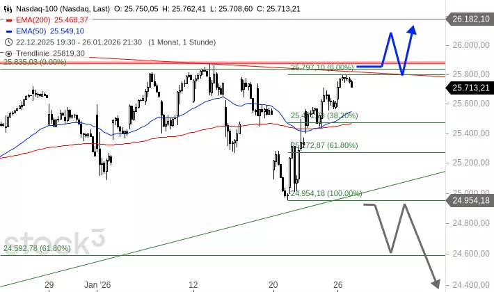 Nachdem der Nasdaq 100 am 20. Januar 2026 bei 24.954 Punkten ein Tief markierte, startete eine dynamische Erholung, die den Index gestern bis auf 25.797 Punkte führte. Damit rückt der seit Oktober 2025 bestehende Abwärtstrend sowie die wichtige Hürde bei 25.835 Punkten unmittelbar in den Fokus. Trotz leichter Gewinnmitnahmen am gestrigen Nachmittag deutet die aktuelle Indikation mit 25.871 Punkten – ein Plus von 158 Punkten zum Schlusskurs – auf eine Fortsetzung der Stärke hin. Das zentrale Motiv ist derzeit der Ausbruchsversuch aus der mehrmonatigen Konsolidierung.