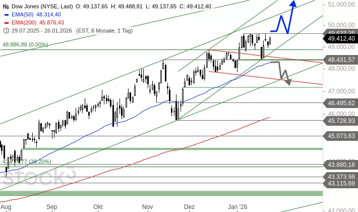 Sollte dem Index ein nachhaltiger Sprung über den Widerstandsbereich bei 49.621/633 Punkten gelingen, wäre der Weg für eine Fortsetzung der übergeordneten Rally frei. Als nächste Ziele stünden dann die Marken bei 50.463 und 51.497 Punkten auf der Agenda. Bleibt der Ausbruch jedoch aus und fällt der Dow Jones stattdessen unter die wichtige Haltemarke bei 48.431 Punkten zurück, trübt sich das kurzfristige Bild ein. In diesem Szenario müsste unverändert mit weiteren Abgaben gerechnet werden, die den Index bis in den Bereich um 47.192 Punkte führen könnten.