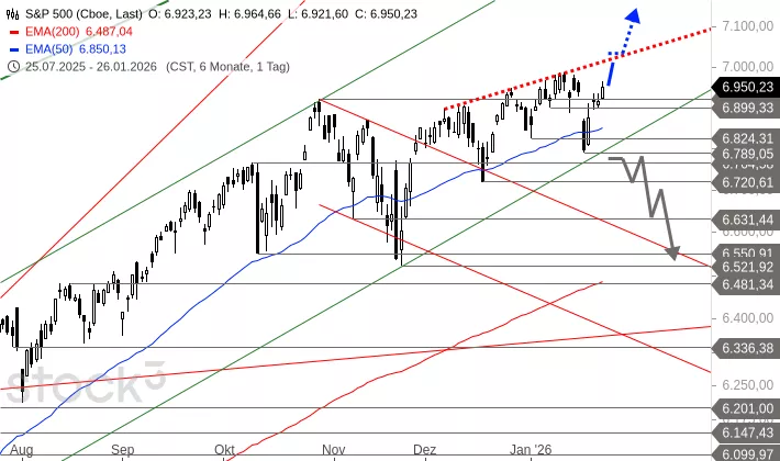 Kurzfristig besteht weiterhin das Potenzial, dass der Index die obere Pullbacklinie bei 7.017 Punkten ansteuert. Ein Ausbruch über dieses Niveau würde zusätzliches Aufwärtspotenzial bis zunächst 7.200 Punkte freisetzen. Kritisch zu werten wäre hingegen ein Rückfall unter das Tief vom 20. Januar, das bei 6.789 Punkten liegt. Sollte diese Unterstützung unterschritten werden, droht der intakte Trend zu brechen. In der Folge müsste mit einer ausgeprägten Abwärtsbewegung gerechnet werden, die den S&P 500 in Richtung der Zone zwischen 6.550 und 6.521 Punkten drücken könnte.