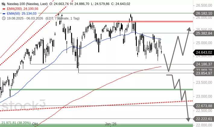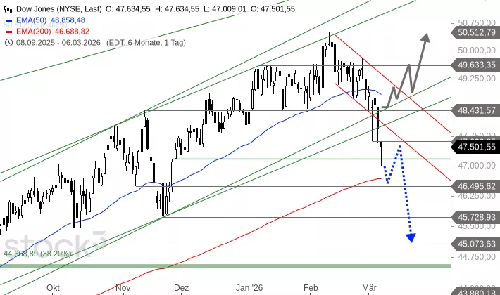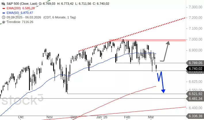 Der S&P 500 bildete nach dem Hoch im Januar 2026 eine Seitwärtsbewegung zwischen der Widerstandszone bei 6.985 bis 7.002 Punkten und der Unterstützung bei 6.789 Punkten aus. Am Dienstag und Freitag fiel er unter die untere Begrenzung, verteidigte aber die Notfallunterstützung bei 6.720 Punkten. Um 9:11 Uhr wird der Index bei 6.636 Punkten deutlich unter dieser Notfallunterstützung getaxt.
