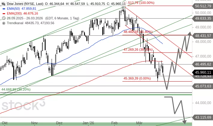 Sollte die Zone zwischen 45.073 und 44.668 Punkten verteidigt werden, bleibt das übergeordnete Kaufsignal aus dem Sommer 2025 voll intakt. In diesem optimistischen Szenario liegt das langfristige Kursziel weiterhin im Bereich von 55.500 Punkten. Die aktuelle Schwäche wäre dann nur ein gesundes Luftholen nach der Rally. Erst wenn die Marke von 44.668 Punkten nachhaltig unterschritten würde, müsste man das bullische Bild revidieren. In diesem Fall würden schnell Ziele bei 43.115 oder sogar 41.401 Punkten auf den Plan der Marktteilnehmer rücken.