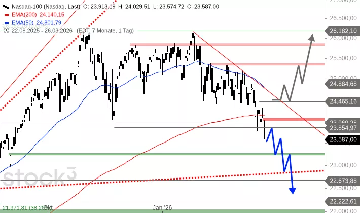 Nach einer massiven Rally erreichte der Nasdaq 100 im Oktober 2025 sein Rekordhoch bei 26.182 Zählern. Ein erneuter Versuch, diese Marke im Januar 2026 zu überwinden, schlug jedoch fehl. Seitdem dominiert eine Korrekturbewegung das Geschehen. Ein Bodenbildungsversuch bei 23.854 Punkten scheiterte jüngst: Mit einem Abwärtsgap zwischen 24.081 und 24.029 Punkten sowie einer langen schwarzen Kerze fiel der Index unter die wichtige Unterstützung. Damit wurde die monatelange Seitwärtsphase nun formal zu einem bärischen Doppeltop.