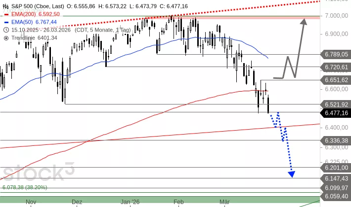 Der S&P 500 steuert auf eine sehr kritische Phase zu. Während der Index gestern noch im Bereich des Tiefs vom 20. März schloss, deuten die aktuellen Taxen um 13:32 Uhr bei etwa 6.447 Punkten auf einen schwachen Handelsstart hin. Sollten sich diese Indikationen im Handel bestätigen, stünde die Unterstützungszone zwischen 6.521 und 6.481 Punkten massiv unter Druck. Noch ist dieser Bereich nicht nachhaltig per Schlusskurs unterboten, doch das Marktumfeld hat sich sichtlich eingetrübt. Die Bullen müssen nun beweisen, ob sie diese Marken zum Handelsstart noch verteidigen können.