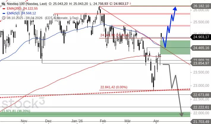Der Nasdaq 100 bildete gestern ein großes Aufwärtsgap zwischen 24.209 und 24.756 Punkten. In der Spitze notierte der Index bei 25.043 Punkten, zugleich der Eröffnungskurs. Der Schlusskurs lag knapp über dem Widerstandsbereich um 24.841 bis 24.884 Punkte. Mit dem gestrigen Anstieg hat sich das Doppeltop, das nach dem Allzeithoch bei 26.182 Punkten entstanden war, endgültig aufgelöst.