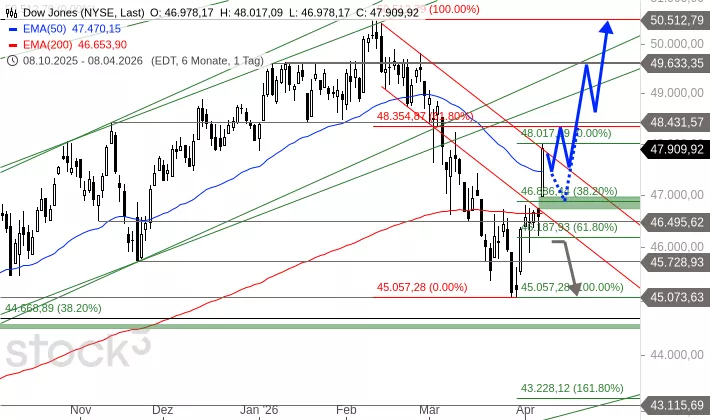 Kurzfristig besteht ein erhöhtes Risiko, dass der Dow Jones in Richtung EMA50 (Tagesbasis) bei 47.470 Punkten oder in das Gap der gestrigen Bewegung zurücksetzt. Mittelfristig existieren weiter Chancen auf eine Rally, zumal noch ein mittel- bis langfristiges Ziel bei ca. 55.500 Punkten offen ist.