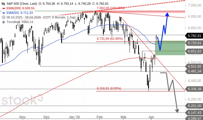 Der S&P 500 bildete gestern ein deutliches Aufwärtsgap zwischen 6.618 und 6.740 Punkten. Er stieg an den Widerstandsbereich um 6.789 Punkte, ohne einen Ausbruch zu schaffen. Mit dem gestrigen Kurssprung wurde die Top-Formation in Form eines Rounding Top, das sich rund um das Allzeithoch bei 7.002 Punkten gebildet hatte, aufgelöst.