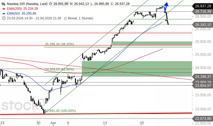 Um diese Formation zu vollenden, müsste der Nasdaq 100 unter das Gap vom Freitag abfallen. Um 13:29 Uhr wird der Index aber bei 26.663 Punkten und damit 184 Punkte über dem gestrigen Schlusskurs getaxt. Fällt er unter 26.400 Punkte, dann ist das ein Startsignal für eine mehrtägige Konsolidierung mit möglichen Abgaben bis 26.182 und 25.164 Punkte. Gelingt dagegen ein Ausbruch über 26.716 Punkte, dann könnte die Rally in Richtung 27.030 und später 27.439 Punkte fortgesetzt werden.