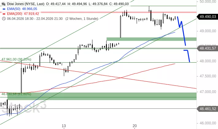 Der Dow Jones eröffnete gestern ebenfalls positiv und kletterte auf ein neues Rallyhoch bei 49.848 Punkten. Allerdings fiel der Index zügig wieder unter den Bereich um 49.633 Punkte zurück. Dieser Bereich stoppte schon am Freitag die Rally der letzten Wochen. Anschließend gab der Dow Jones bis auf 49.046 Punkte nach. In dieser Abwärtsbewegung wurden aber keine wichtigen Unterstützungen verletzt. Um 13:30 Uhr wird der Index bei 49.415 Punkten getaxt.