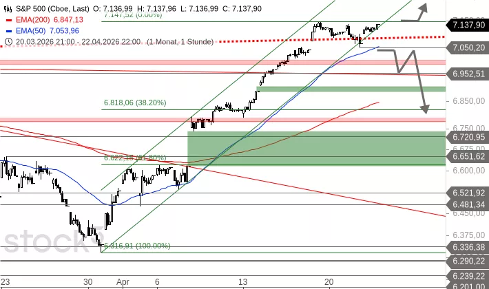 Damit liegt der S&P 500 wieder über dieser Trendlinie. Steigt der Index über 7.147 Punkte und damit auf ein neues Allzeithoch an, könnte die Rally der letzten Wochen zügig in Richtung der oberen Begrenzung bei aktuell 7.317 Punkten fortgesetzt werden. Sollte der S&P 500 allerdings unter das gestrige Tagestief abfallen, dann wäre mit einer Konsolidierung bis in den Bereich um 6.818 bis 6.789 Punkte zu rechnen.