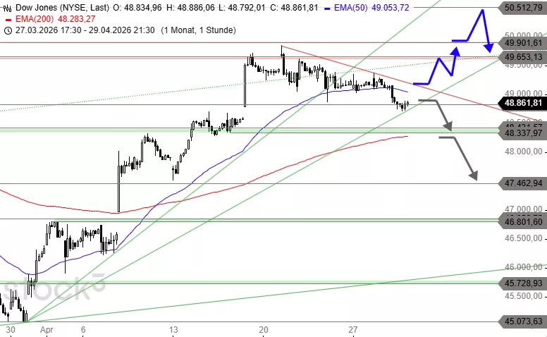 Der Dow Jones hat jetzt die Chance, die Abwärtstrendlinie auf Höhe von 49.180 Punkten zu durchbrechen und direkt die Hürde bei 49.653 Punkten anzulaufen. Danach käme das Hoch vom 21. April bei 49.848 Punkten ins Bild. Darüber wartet der starke Widerstand bei 49.901 Punkten. Sollte der Kurs dagegen im Bereich von 49.350 Punkten nach unten abprallen, ist ein Rücksetzer in das heutige Aufwärts-Gap anzunehmen. Problematisch wird aktuell ein Bruch der Aufwärtstrendlinie auf Höhe von 48.900 Punkten. Damit wäre ein Verkaufssignal aktiviert und ein Einbruch bis 48.337 Punkte die Folge.