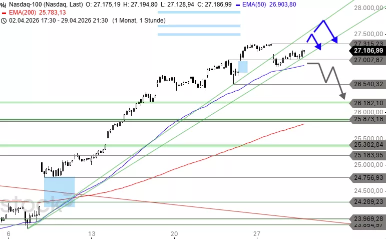 Nachdem die Nasdaq-Schwergewichte Microsoft, Amazon, Alphabet und Meta gestern Zahlen geliefert hatten, steht in Summe eine bullische Vorbörse an. Der Nasdaq 100 Index dürfte ebenfalls mit einem Aufwärts-Gap im Bereich von 27.400 Punkten auf einem neuen Rekordhoch eröffnen.