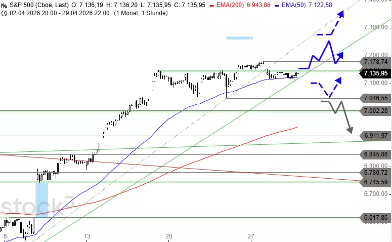 Mit einem Sprung über 7.178 Punkte könnte sich der S&P 500 weiter bis an das große Kurszielgebiet bei 7.240 bis 7.265 Punkten nach oben schrauben. Auf diesem Niveau sollte die Rally vorerst gestoppt werden und eine weitere Kaufwelle bis 7.390 Punkte zunächst ausbleiben. In der Folge dürfte der Index zurück an das vorherige Rekordhoch bei 7.178 Punkten korrigieren. Dort wäre mit einem weiteren Rallyversuch zu rechnen. Kurse unter 7.147 Punkten würden dagegen für den Start einer größeren Korrektur sprechen, die direkt bis 7.046 Punkte führen kann.