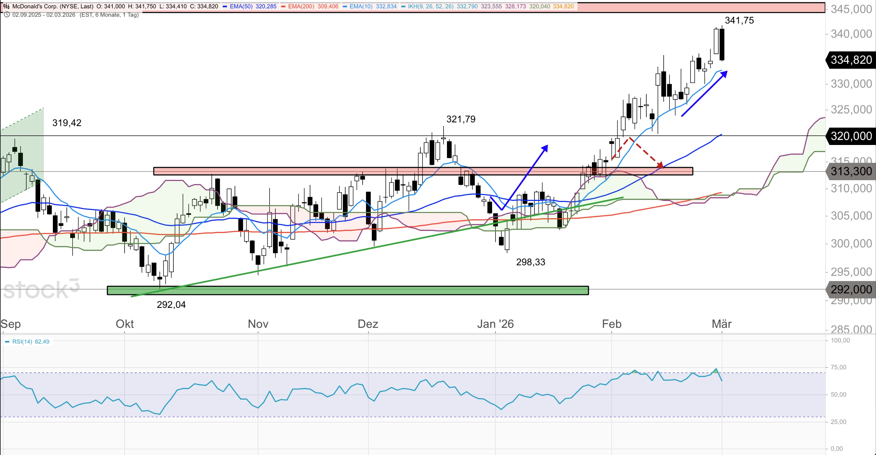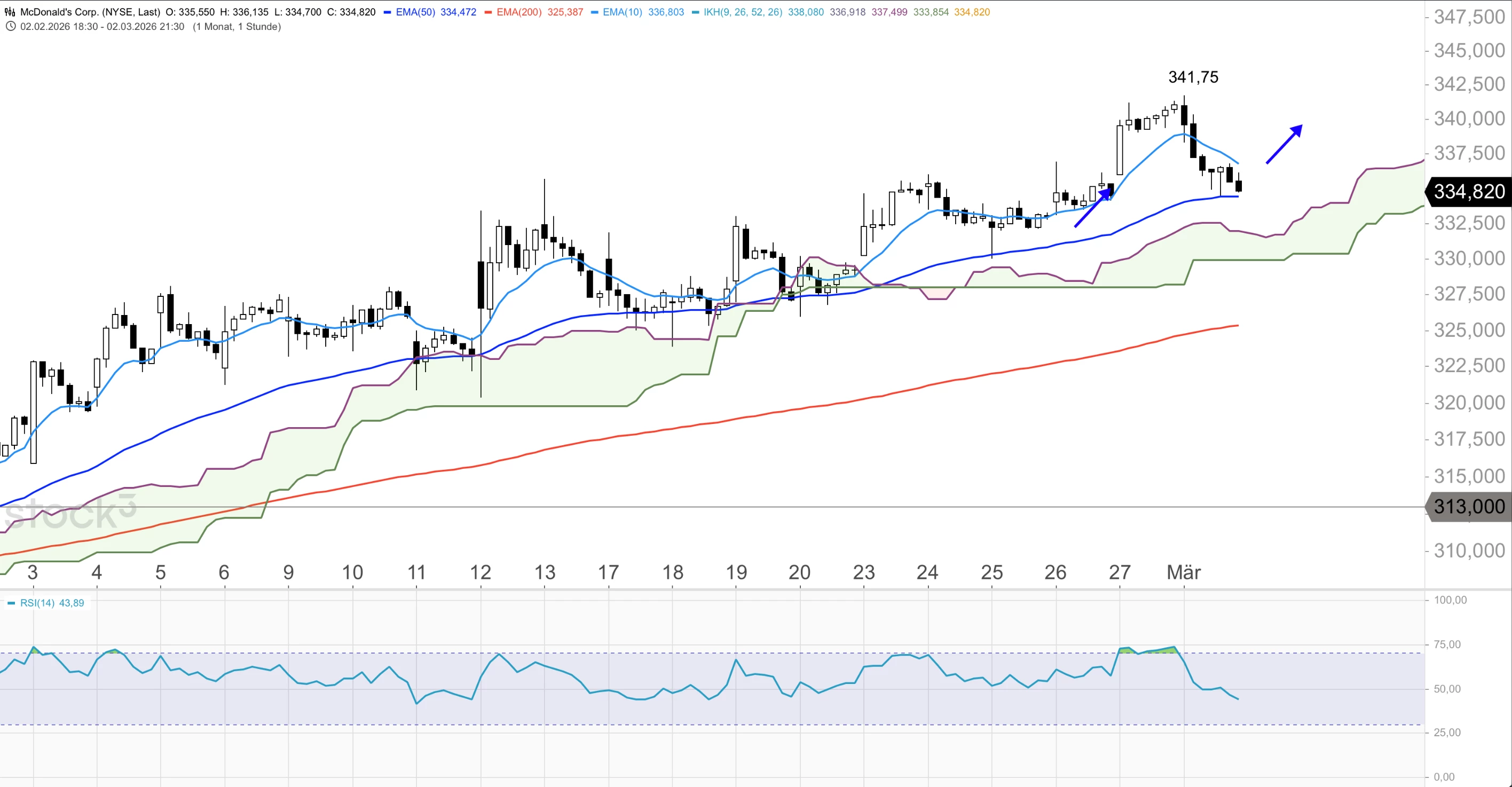 Die McDonald's-Aktie notiert im Tageschart oberhalb der Ichimoku-Wolke und über allen wichtigen gleitenden Durchschnitten und zeigt damit weiter klar Stärke. Im Stundenchart ist der Titel jedoch unter den 10er-EMA bei 336,80 USD zurückgefallen und könnte am 50er-EMA bei 334,47 USD Halt suchen. Gelingt dem Titel der erneute Anstieg über 336,80 USD, ist ein neuer Anlauf auf das Verlaufshoch bei 341,75 USD und zum Widerstand um 345 USD wahrscheinlich. Auf der Unterseite bietet der Bereich um 332,00 USD Halt, darunter die Zone um 325,00 USD.