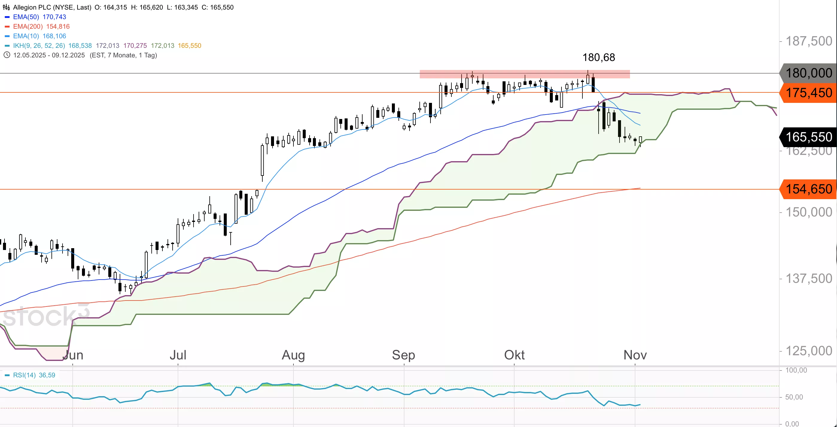 Die Allegion-Aktie konnte in den vergangenen Monaten kräftig ansteigen, kam ab September aber am Widerstand um 180 USD nicht mehr weiter. In den Vorwochen wurden zahlreiche Angriffe der Bullen auf diesen Bereich abgewehrt, und der Titel prallte um 180 USD immer wieder nach unten ab. Am 23. Oktober prallte die Allegion-Aktie per Gap-down endgültig nach unten ab und rutschte dabei auch unter den 10er- und 50er-EMA im Tageschart. Zudem kam es zu einer bärischen Überschneidung des 10er- unter den 50er-EMA. Am Vortag ging das Papier bei 165,55 USD aus dem Handel.