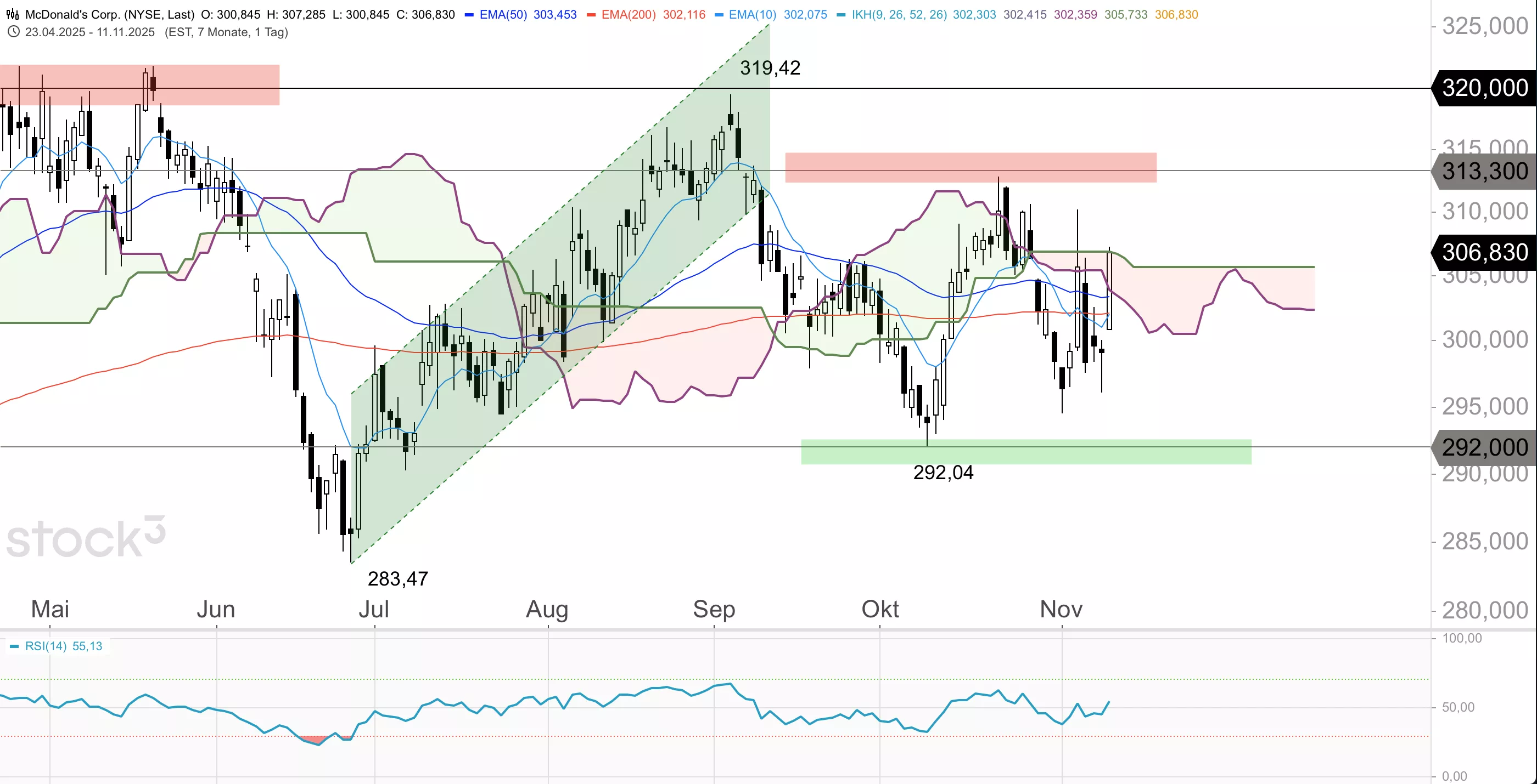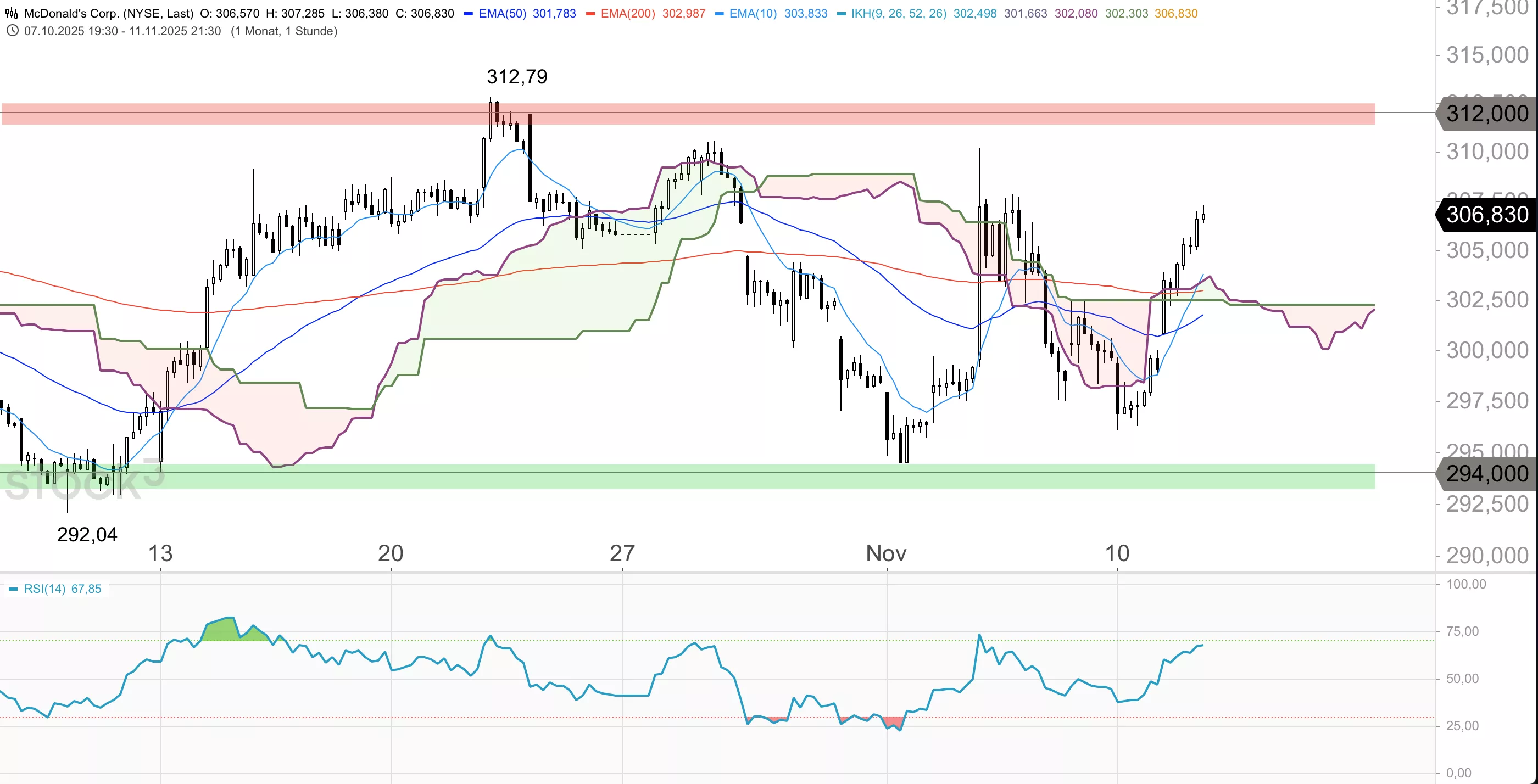 Die Aktie von McDonald's konnte den Rücklauf nach dem Fehlausbruch aus der Ichimoku-Wolke mit der bullischen Tageskerze vom Montag beenden und erneut ansteigen. Die Tageskerze vom Montag mit dem langen unteren Schatten und dem kleinen Kerzenkörper deutete bereits ein Ende der Korrektur an, und am Vortag kam es dann auch zu einem starken Kursanstieg, wobei das Papier direkt an der oberen Begrenzung der Ichimoku-Wolke bei 306,83 USD und nur leicht unter dem Tageshoch bei 307,26 USD aus dem Handel ging.