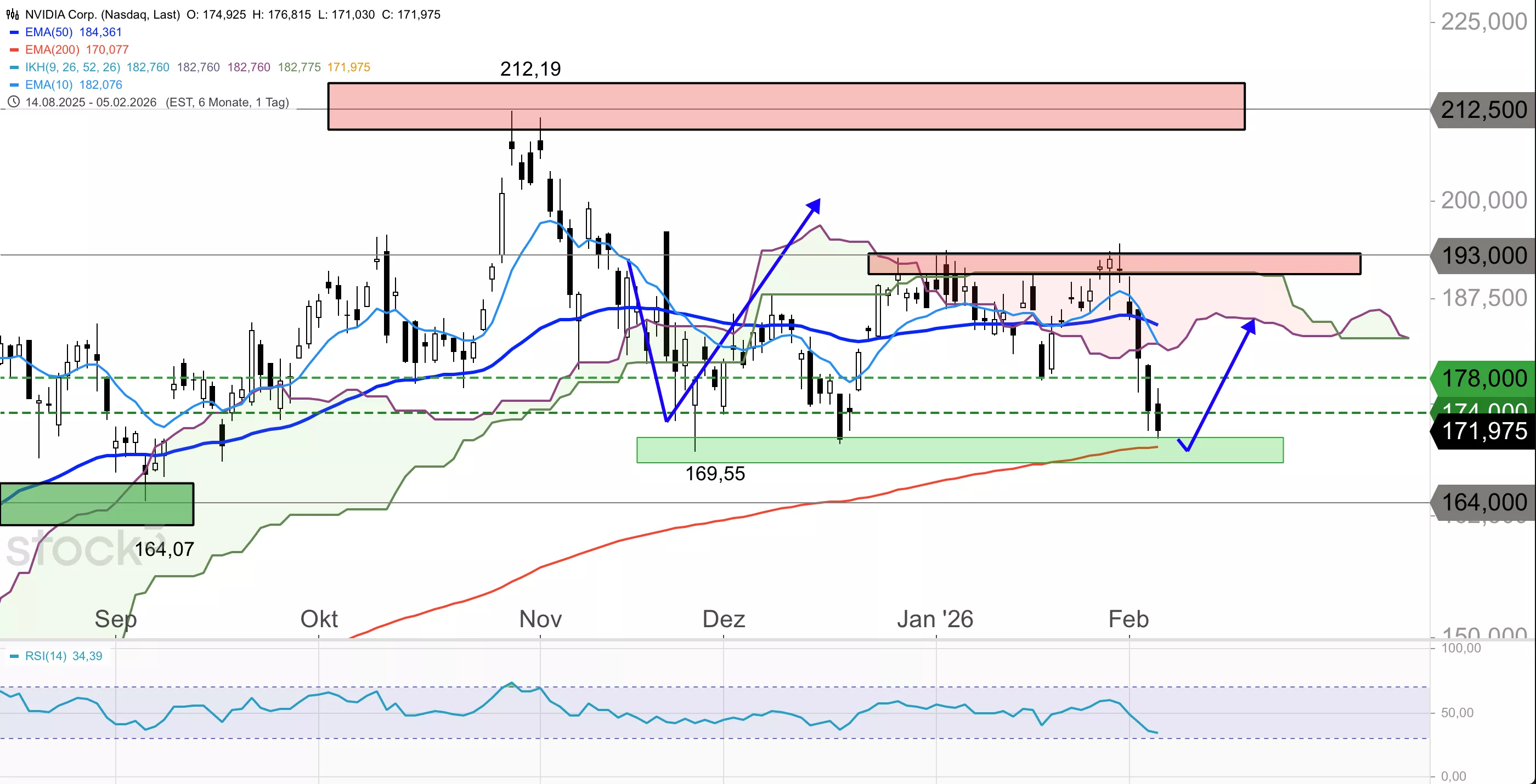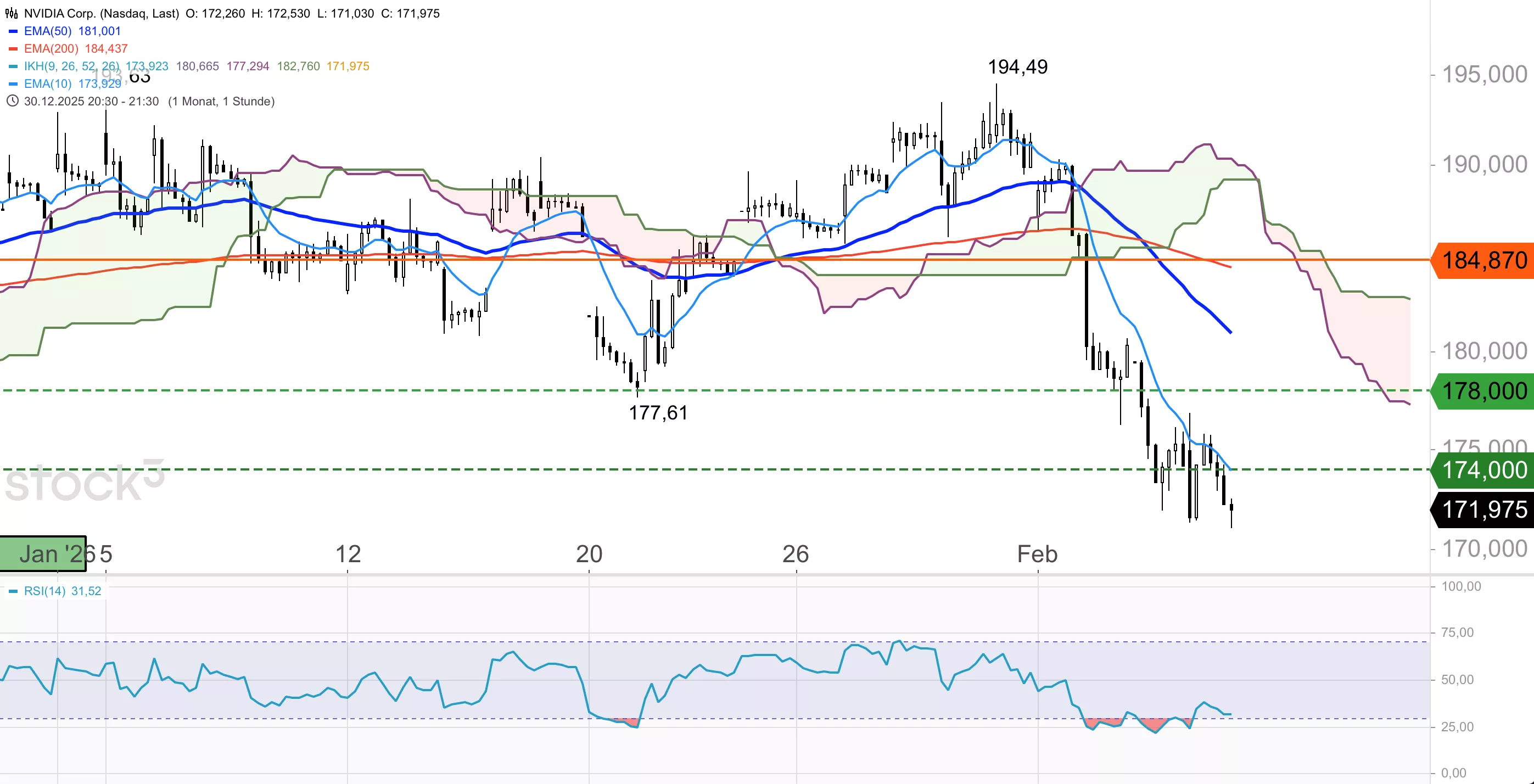 Die Nvidia-Aktie befindet sich seit dem Verlaufshoch bei 212,19 USD von Anfang November im Abwärtstrend und ist am Vortag erneut kräftig unter Druck geraten. Im Tagestief fiel das Papier bis auf 171,03 USD und damit in die Nähe des 200er-EMA bei 170,08 USD. Damit notiert der Titel klar unter dem 10er-EMA bei 182,08 USD und unter dem 50er-EMA bei 184,36 USD sowie unter der Ichimoku-Wolke. Per Börsenschluss ging die Aktie mit einem KGV von 42,8, einem fairen Wert von 206,42 USD und einem durchschnittlichen Analystenkursziel von 253,62 USD bei 171,98 USD aus dem Handel.