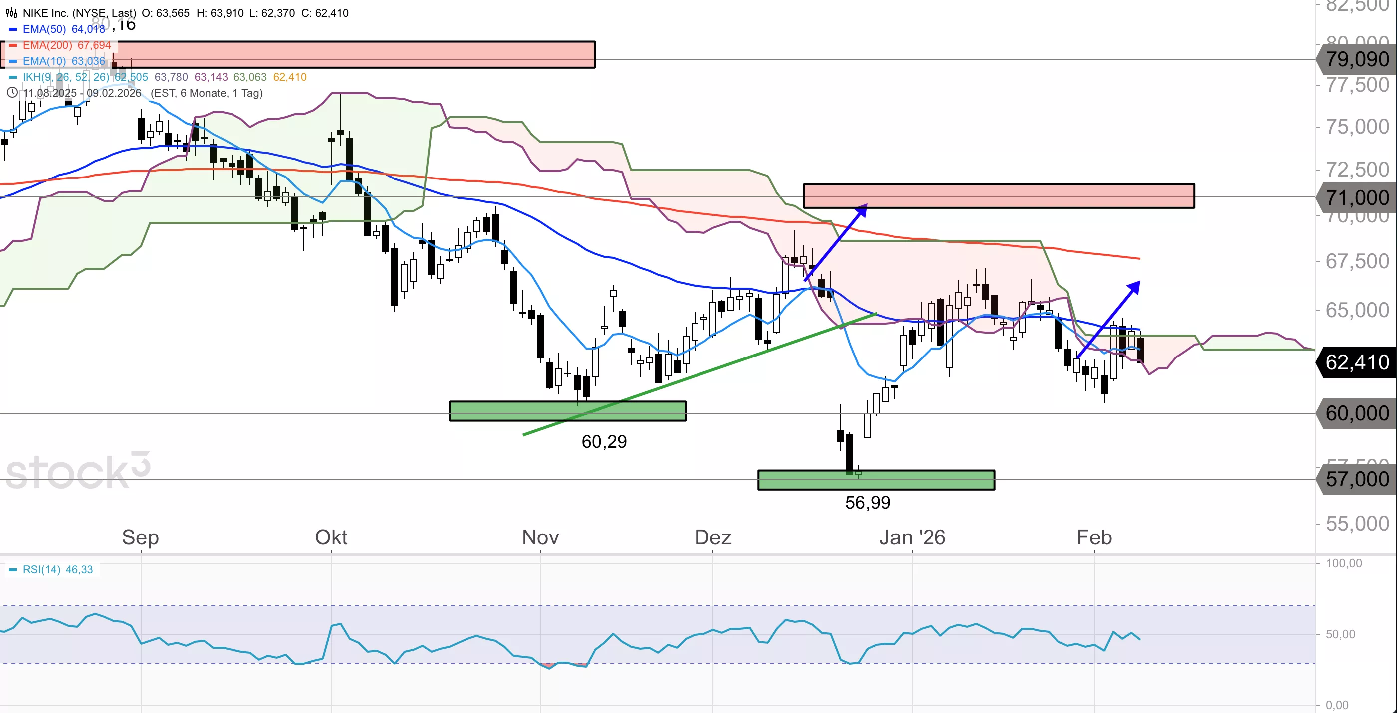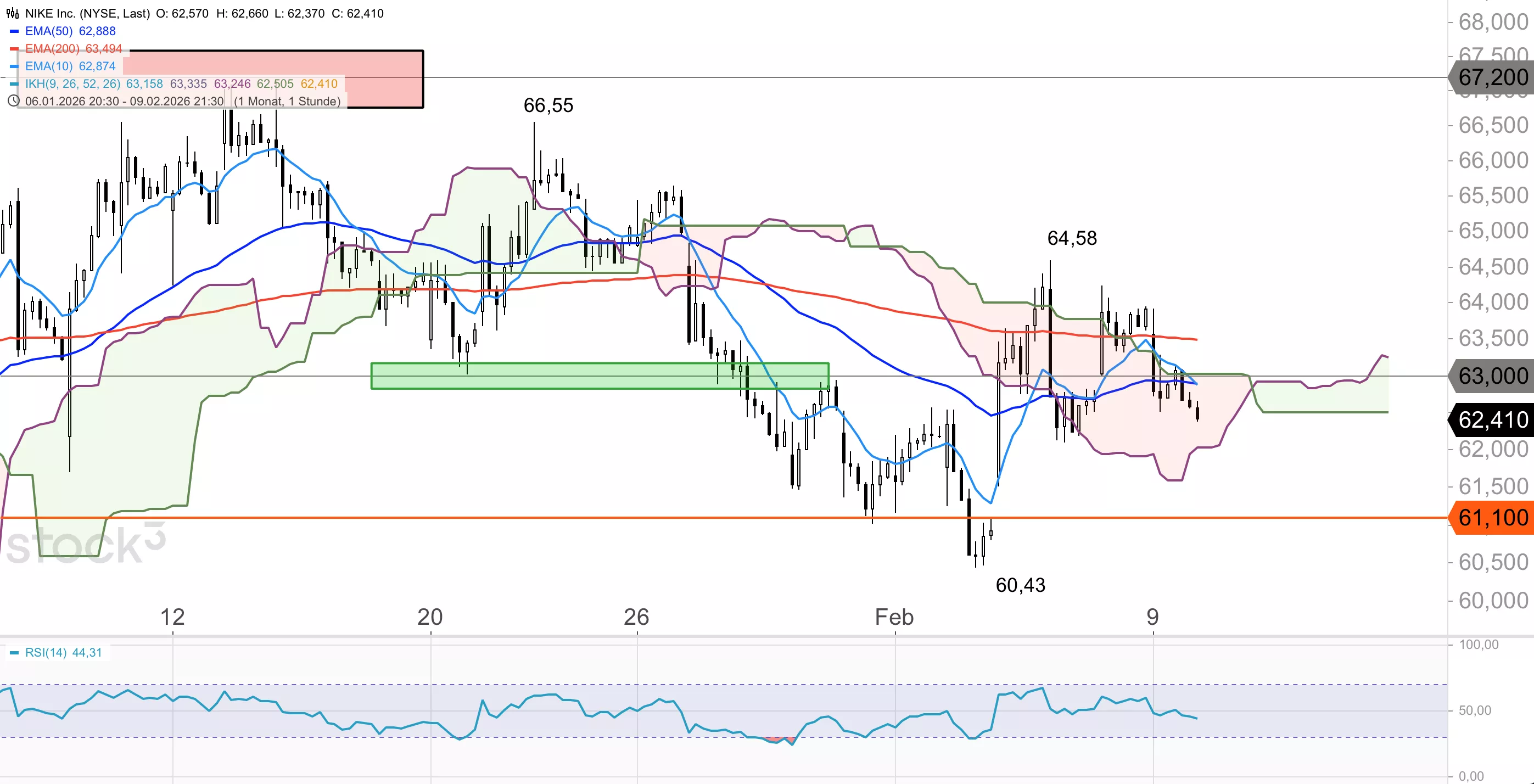 Die Nike-Aktie befindet sich in einem mittelfristigen Abwärtstrend und notiert deutlich unter dem 200er-EMA, der aktuell im Bereich von 67,69 USD verläuft. Im Dezember markierte das Papier ein Verlaufstief bei 56,99 USD, bevor eine Erholung einsetzte, die den Titel bis auf 66,55 USD führte. Diese scheiterte jedoch am 200er-EMA und es kam zu einem erneuten Rücksetzer. Zuletzt stabilisierte sich die Aktie im Bereich von 60,43 USD, fiel dann aber wieder unter die obere Begrenzung der Ichimoku-Wolke im Stundenchart zurück. Am Vortag ging das Papier bei 62,41 USD aus dem Handel.