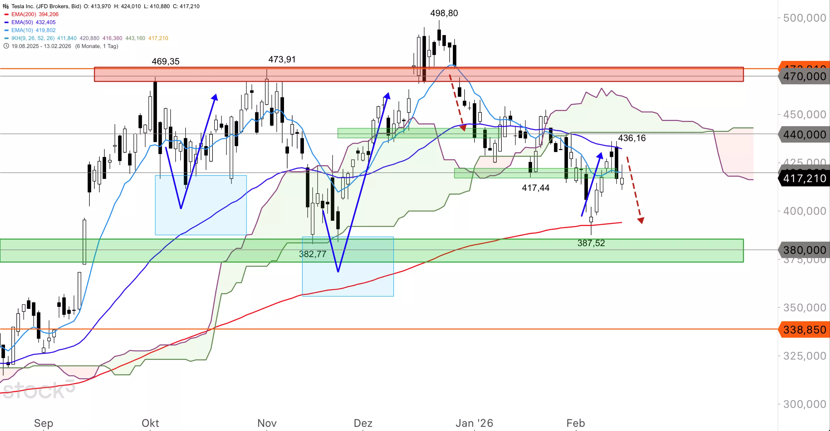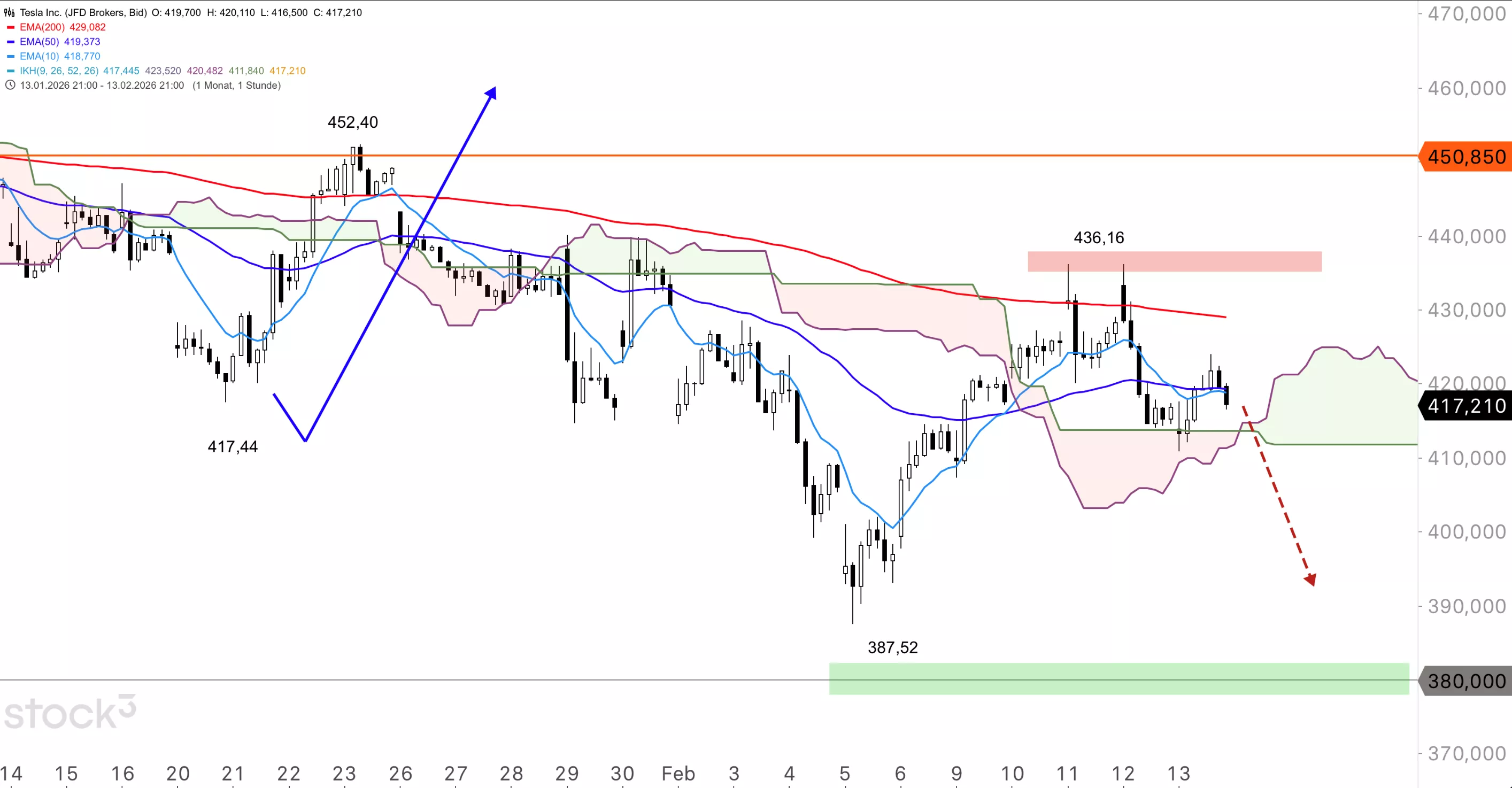 Die Tesla-Aktie notiert im Tageschart unterhalb der Ichimoku-Wolke und erneut unter dem 10er-EMA bei 419,80 USD sowie dem 50er-EMA bei 432,41 USD. Im Stundenchart könnte ein Kursrutsch unter die Ichimoku-Wolke bevorstehen, zumal die Aktie saisonal ab Mitte Februar bis Ende März im 10-Jahres-Schnitt eher schwächer tendiert. Kann der Titel den 10er-EMA zurückerobern, ist die Zone um 436,16 USD der nächste Anlaufbereich. Auf der Unterseite droht unter 410,00 USD aber ein erneuter Test des Februar-Tiefs bei 387,52 USD und ein Kursrutsch bis auf 380,00 USD.