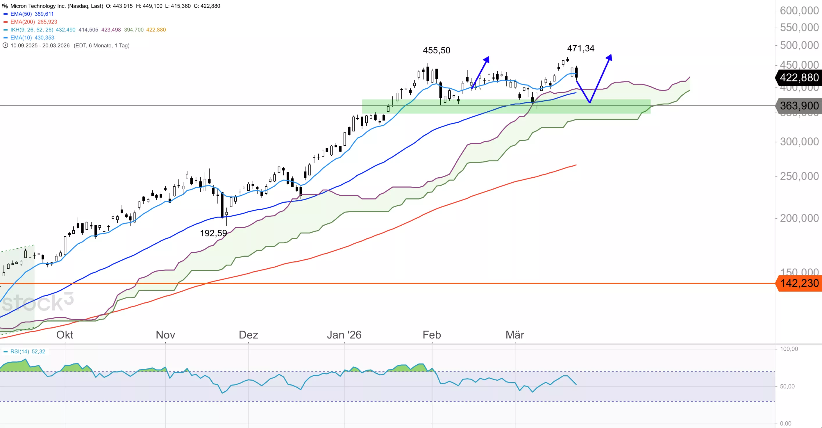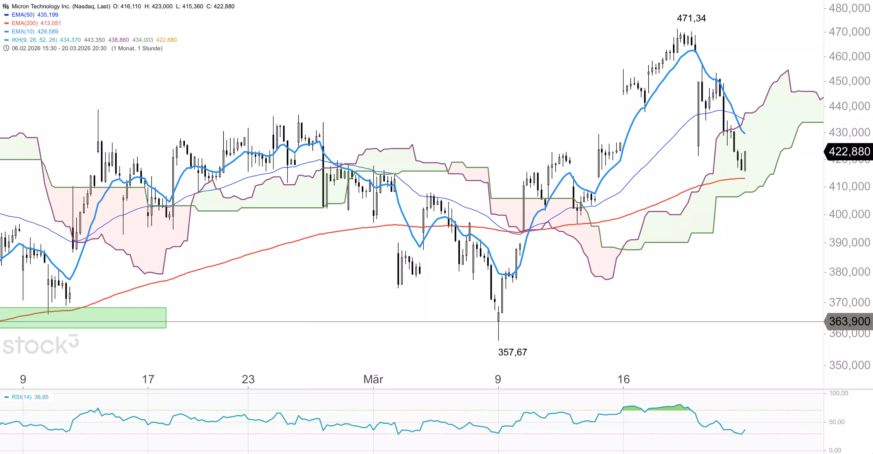 Die Micron-Aktie kam nach den Q2-Quartalszahlen am 18. März unter Druck und fiel vom Verlaufshoch bei 471,34 USD auf 422,88 USD zurück, wobei der Kurs am Freitag knapp unterhalb des 10er-EMA (430,35) und nahe der oberen Begrenzung der Ichimoku-Wolke schloss. Der 50er-EMA verläuft mit 389,61 USD deutlich tiefer und stützt den mittelfristigen Aufwärtstrend. Der RSI(14) liegt mit 52,32 im neutralen Bereich. Per Börsenschluss ging das Papier mit einem KGV von 35,80, einem fairen Wert von 375,10 USD und einem Analystenkursziel von 532,28 USD bei 422,88 USD aus dem Handel.