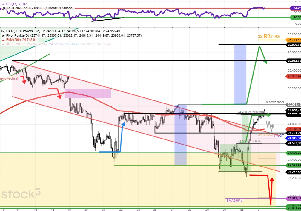 Die Abwärtstrendlinie der letzten Wochen wurde überschritten, positiv. Der DAX hat das Ziel aus einem kleinen Doppelboden bei 24.908 erreicht. Der Index ist seit dem Erreichen von 24.908/24.925 über den Stundenchart-RSI gerechnet überkauft (RSI 71). Genau da taktet um 8:10 Uhr die DAX-Vorbörse. Daraus entstehen meist stundenweise Pullbacks, wobei im aktuellen Fall der Bereich 24.750/23.705 das Pullbackziel wäre. Jeder Handel über 24.925 und über 25.020 zeigt heute Stärke der DAX-Käufer an. Methodisch korrekt gilt: Der DAX wird erst über 25.020 ein Tageskerzenchart-Kaufsignal liefern, und das auch nur, wenn der DAX per Tagesschluss über 25.020 endet. Das Ziel aus dieser größeren Bodenbildung wäre dann theoretisch 25.690.