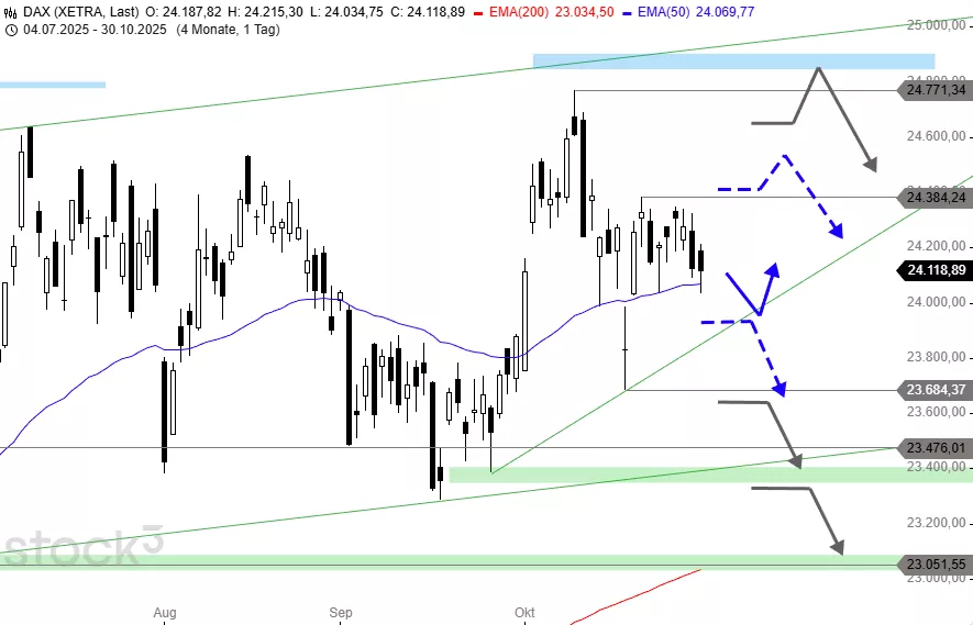 Im gestrigen Handel setzte sich die kurzfristige Abwärtstendenz beim DAX nach einer zunächst bullischen Eröffnung letztlich mit dem erneuten Bruch des Supports bei 24.140 Punkten fort. Die Unterstützung bei 24.035 Punkten wurden im Rahmen der kleinen Verkaufswelle aber verteidigt. Damit bleibt der DAX zunächst noch in der breiten Range der letzten Tage.