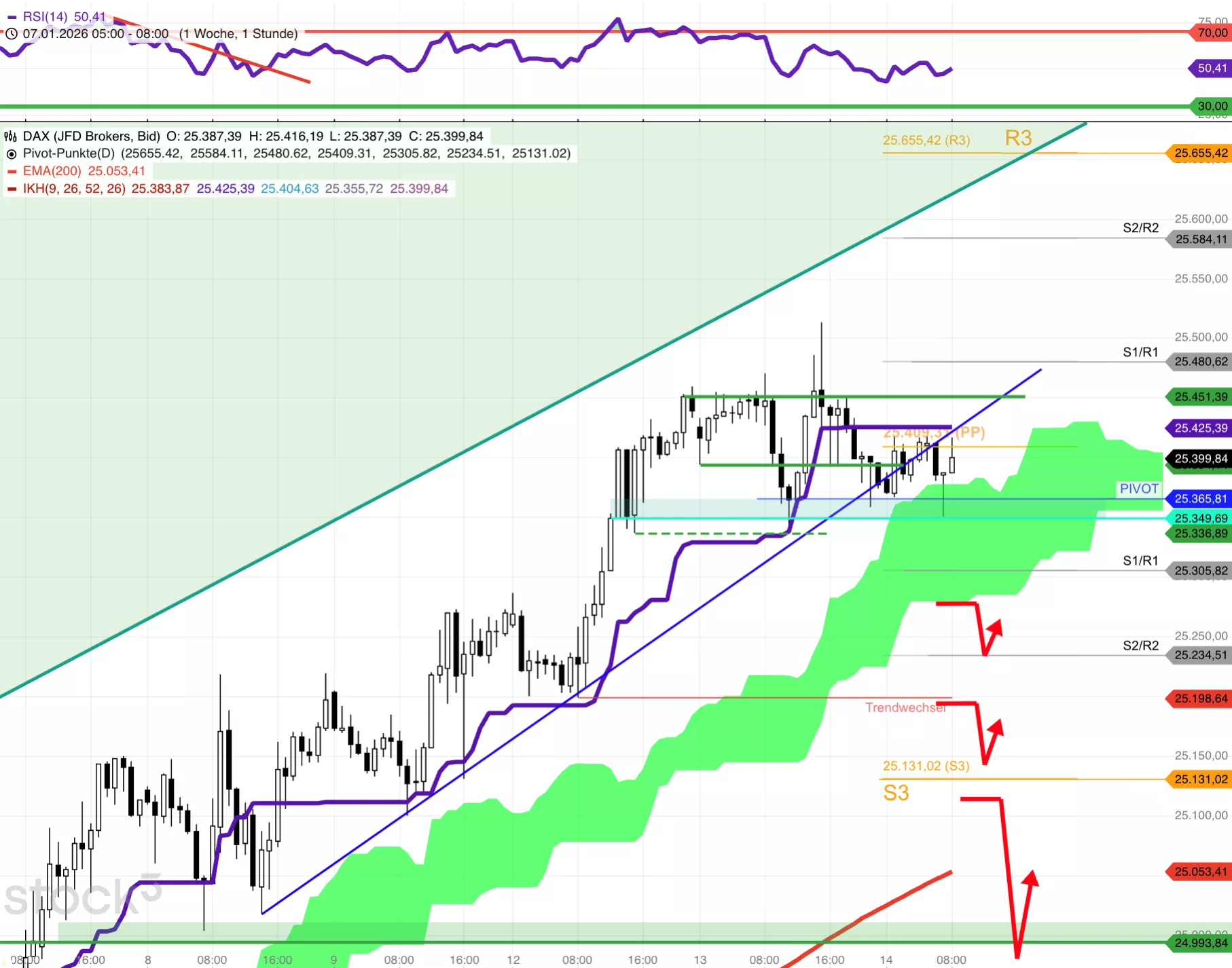 Der DAX ist nun unter dem Kijun 25.425, negativ. Der DAX dringt leicht in die Wolke 25.375-x ein, Warnung. Der DAX verließ den steilen Trend, Warnung. Der VDAX steigt mit dem DAX seit 10 Tagen an, negativ. Der DAX ist über 25.199 per Definition noch im Aufwärtstrend, denn es besteht eine Reihung höherer Hochs. Indiziendeutung/DAX-Prognose: In der Hauptvariante bewegt sich der DAX zunächst mehrere Stunden zwischen dem gestrigen Tief 25.338 und dem Kijun/h1 bei 25.425. Der DAX hat es heute schwer, über 25.425 hinauszukommen. Im Erfolgsfall lockt das maximale Tagesziel der Oberseite bei 25.655 (R3). In der Regel ist aber bei 25.425 Schluss, und der DAX kehrt wieder nach unten um. Sollte der DAX aus der grünen Wolke (25.280) nach unten herausfallen, wäre der Weg frei bis 25.200 und später zu 25.130 (S3).