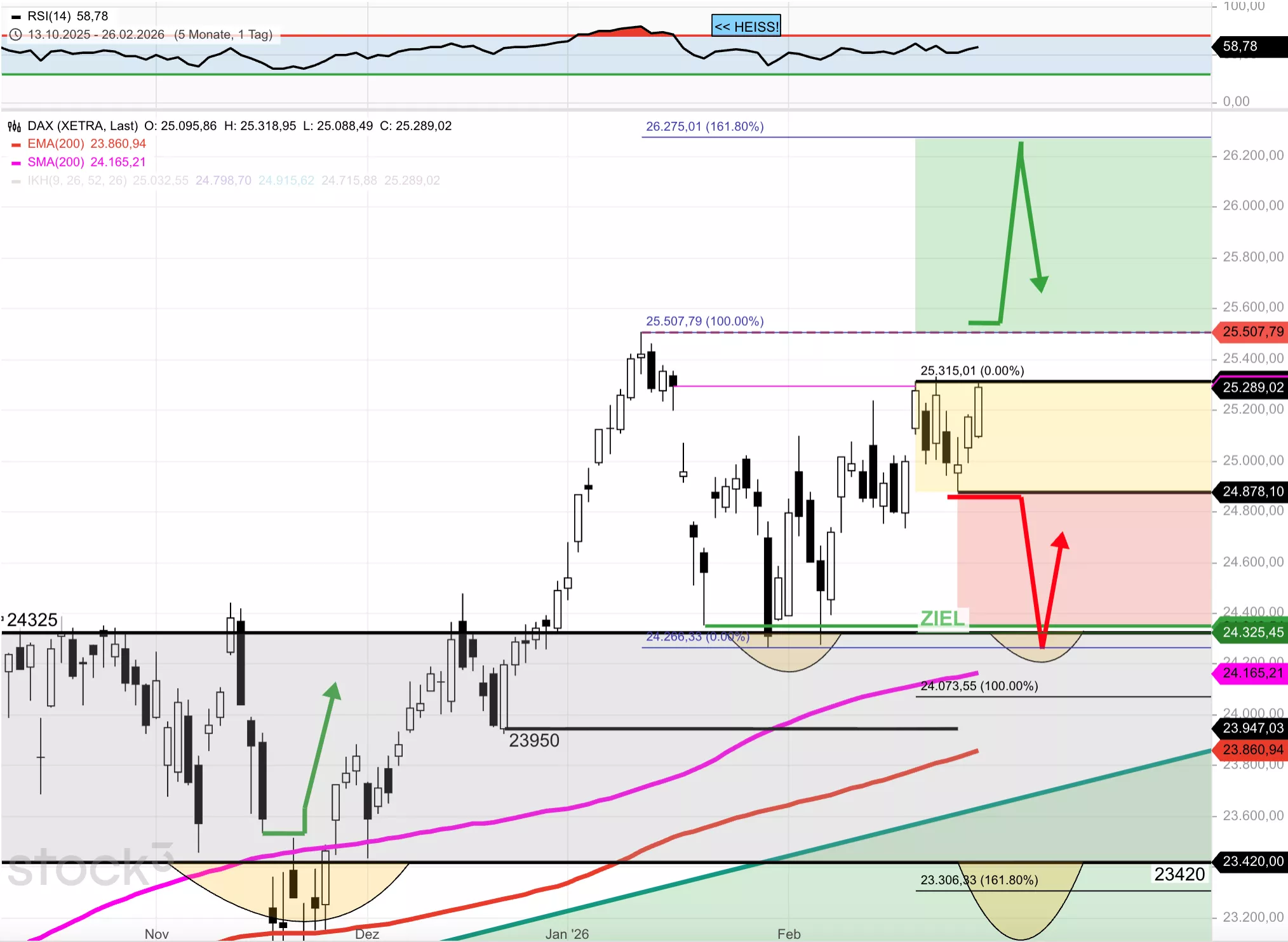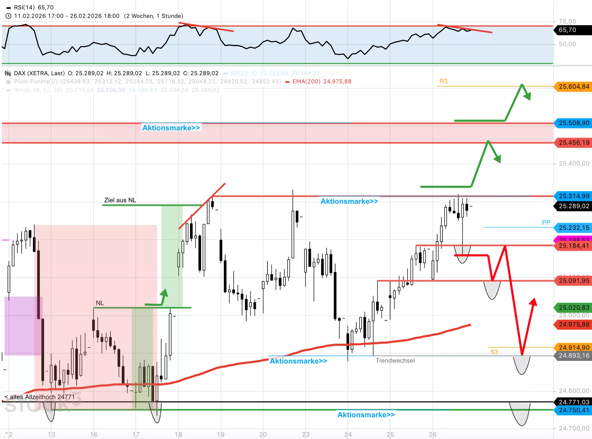 Bei 25.315 + 25.450 + 25.510 Punkten.Und wo liegen die Unterstützungen?