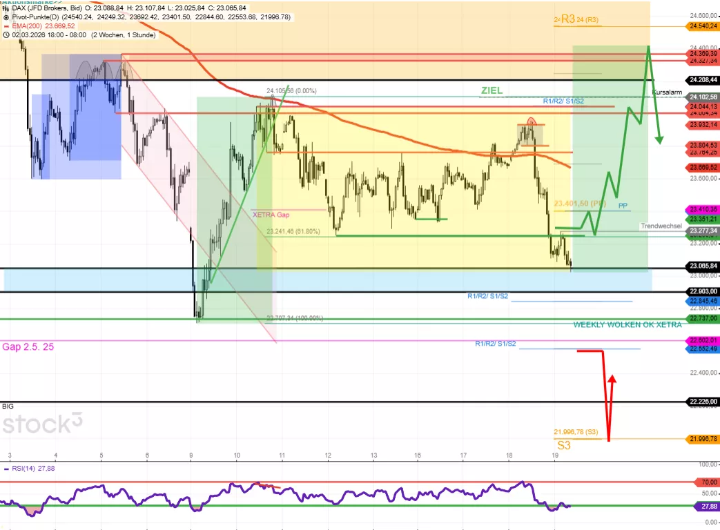 Die DAX-Vorbörse war schon gestern Abend am Backdoor-Neuaufbau-Level 23.250 angekommen und aktuell sogar darunter! Reserve-Unterstützung 23.050 erreicht.