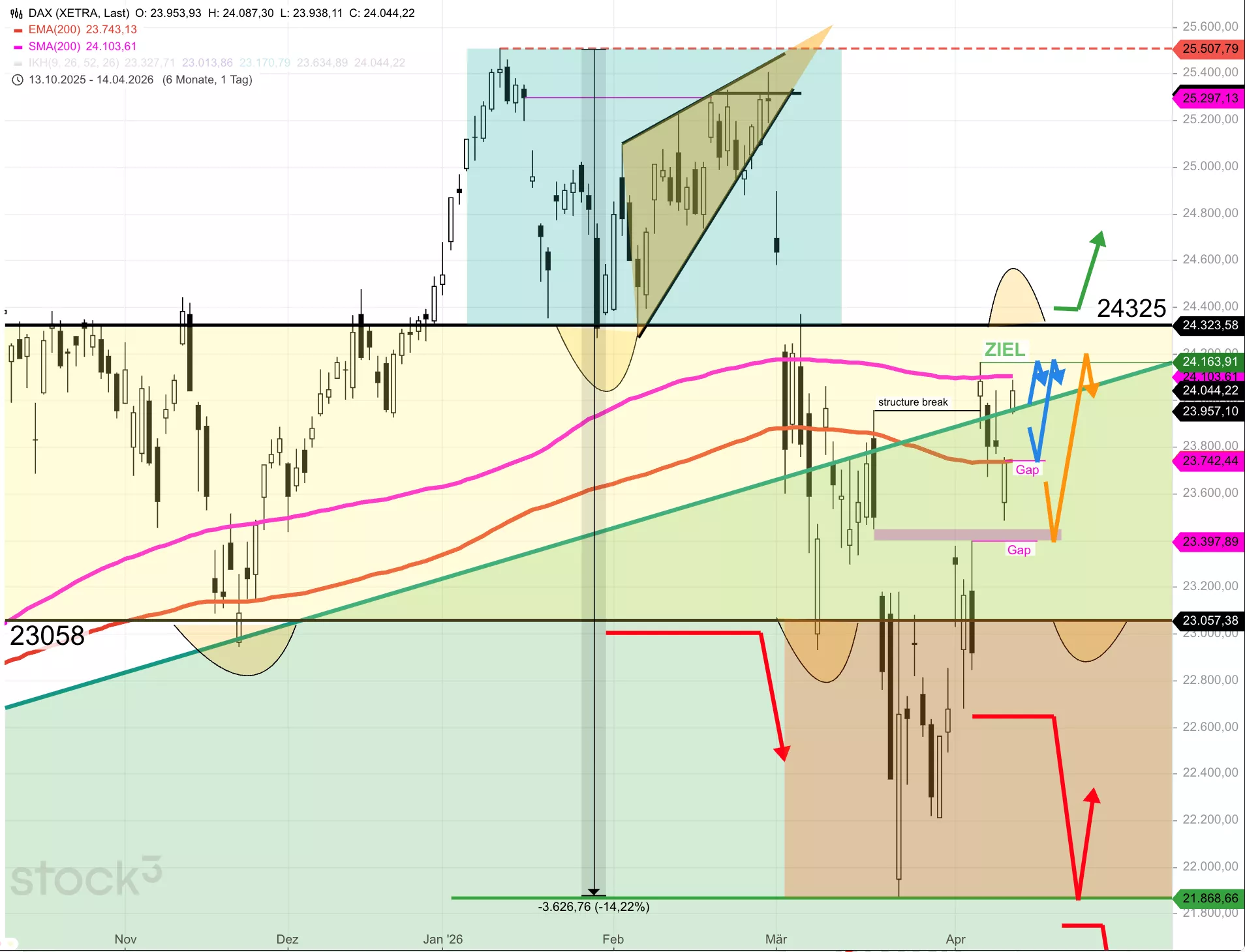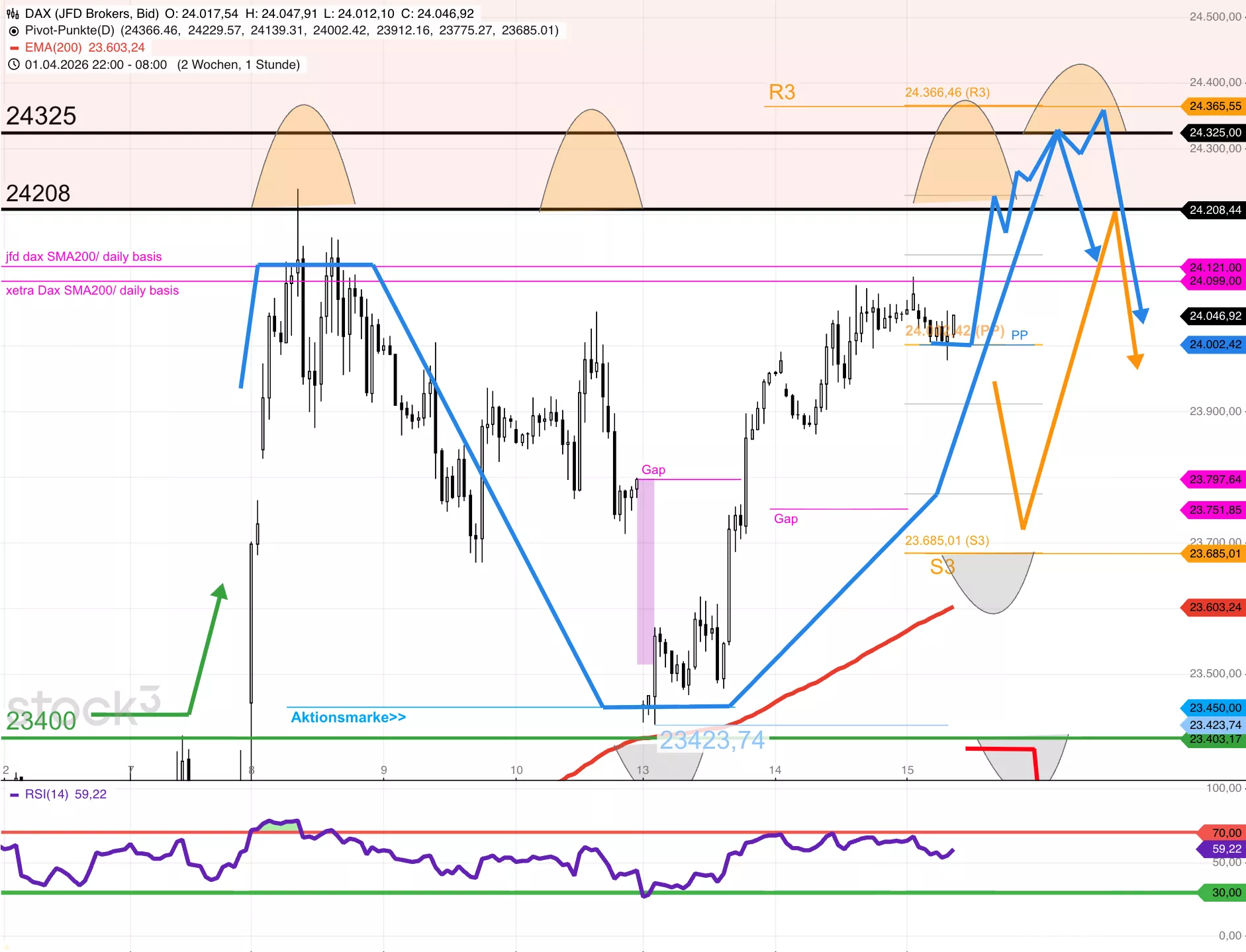 Nach dem DAX-Turbokäufertag am 8. April sollte der DAX einen Pullback von 24.200 zu 23.400 starten (Stichwort "FADING THE GAP"). Das traf zu. Der DAX fiel von 24.200 bis ca. 23.424 und zog dann prompt wieder an, ist mittlerweile schon wieder von 23.424 zu 24.100 geklettert.