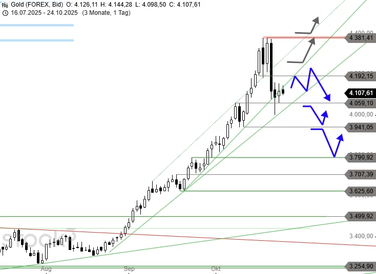 Seit Freitag hat das Kursziel bei 4.375 USD seine den Aufwärtstrend begrenzende Wirkung vollends entfaltet und die Goldpreisrally nicht nur mit einem Doppeltop auf diesem Niveau gestoppt, sondern den Kurs auch direkt an die zentrale Aufwärtstrendlinie fallen lassen. Der historische Abverkauf unter den Support bei 4.192 USD und das Zwischentief bei 4.181 USD ließ den Goldpreis am Mittwoch zweimal an die 3.999-USD-Marke einbrechen. Hier startete zuletzt eine volatile Erholung, die aktuell knapp unter dem Zwischenhoch bei 4.161 USD konsolidiert wird.