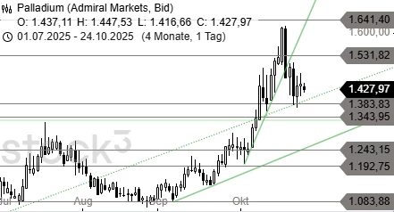 Palladium unternimmt weiter den Versuch, die Hürde bei 1.462 USD in Richtung 1.531 USD zu durchbrechen. Sollte der Versuch scheitern und der Kurs unter 1.383 USD fallen, dürfte sich der Abverkauf der letzten Tage bis 1.343 USD und 1.292 USD ausdehnen.