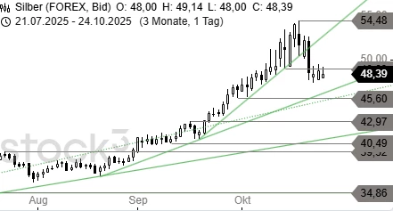 Die seit Mittwoch laufende, dreiteilige Erholung ist weiter intakt und könnte mit einem Anstieg über 4.161 USD bis an den Widerstand bei 4.192 USD und die Kursbarriere bei 4.235 USD führen. An diesen Marken sollte sich aber schon der nächste Einbruch in Bewegung setzen und bei Kursen unter 4.059 USD direkt an die beiden Tiefs bei 3.999 USD führen. Unter der Supportzone dürfte Gold ausgehend von 3.941 USD eine weitere Erholungschance besitzen. Darunter käme es zu einem Kurseinbruch auf 3.860 USD und 3.790 USD. Erst bei Kursen deutlich über 4.235 USD wäre der massive Kurssturz gekontert.