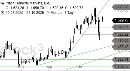 Vom Einbruch auf 1.486 USD konnte sich Platin schnell erholen und bereits gestern wieder über die Hürde bei 1.630 USD ansteigen. Mit einem Ausbruch über 1.663 USD könnte sogar das Hoch bei 1.729 USD direkt erreicht werden. Unter 1.526 USD ist die Erholung dagegen beendet.