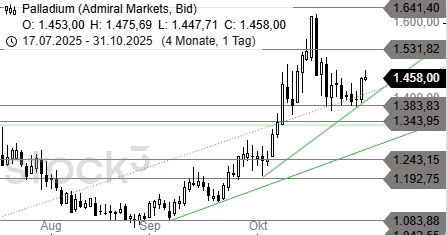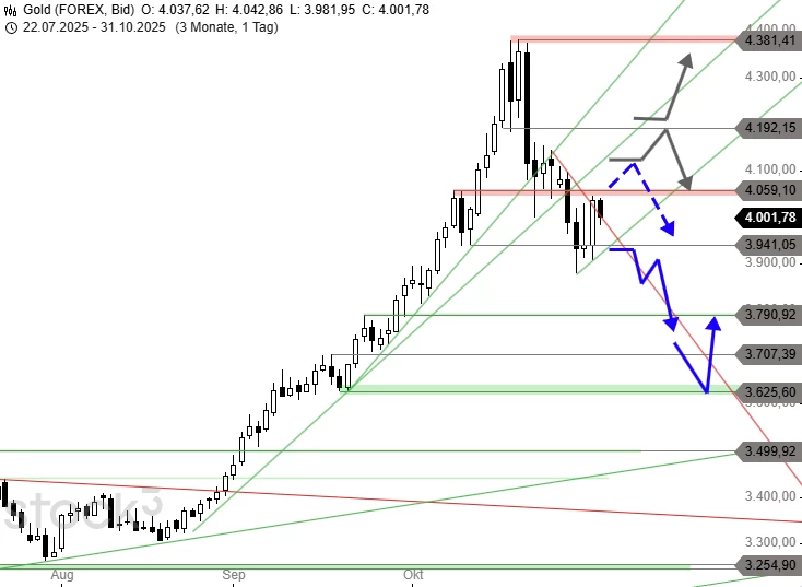 Die Erholung oberhalb des Abwärtsziels bei 3.860 USD ist bislang an der Hürde bei 4.059 USD gescheitert und könnte schon bei einem Bruch des Supports bei 3.941 USD in den nächsten Abverkauf auf 3.860 USD münden. Darunter stünde eine starke Abwärtstrendphase bis 3.765 USD an, die sich auch kurz bis 3.725 USD und 3.707 USD ausweiten kann. Für die Fortsetzung der Erholung bräuchte es dagegen den Anstieg über 4.059 USD. In diesem Fall könnte der Kurs schnell bis 4.115 und 4.125 USD steigen. Hier droht statt eines Kaufsignals allerdings ein weiterer Einbruch.